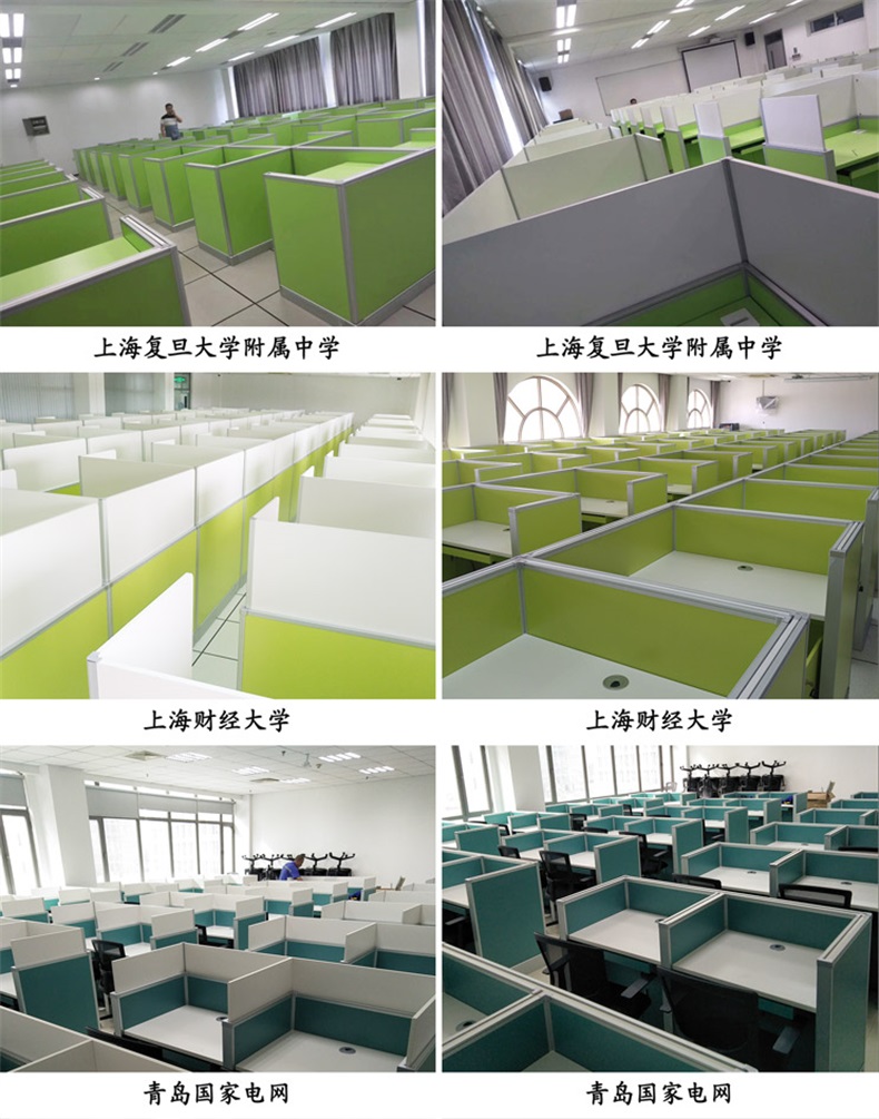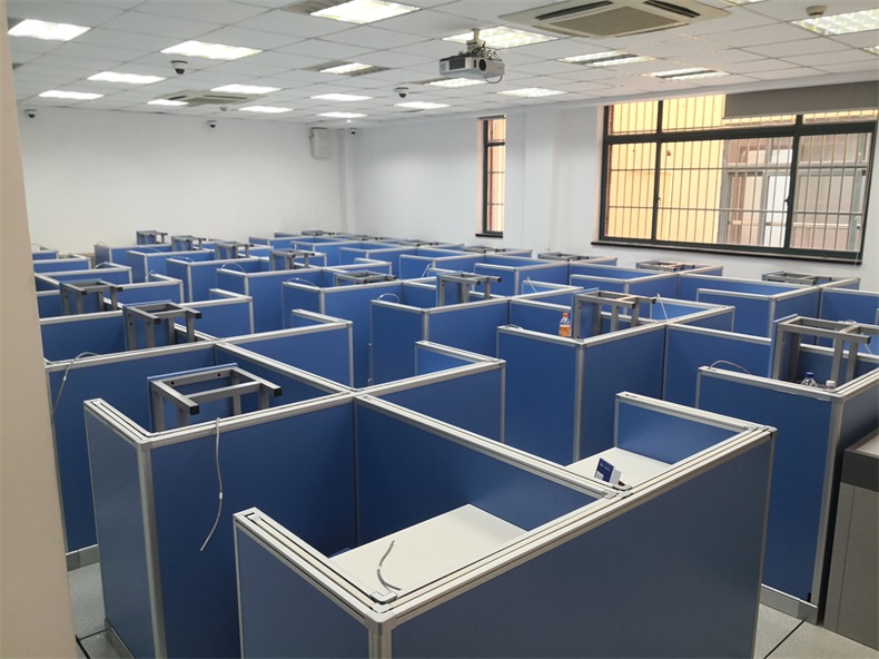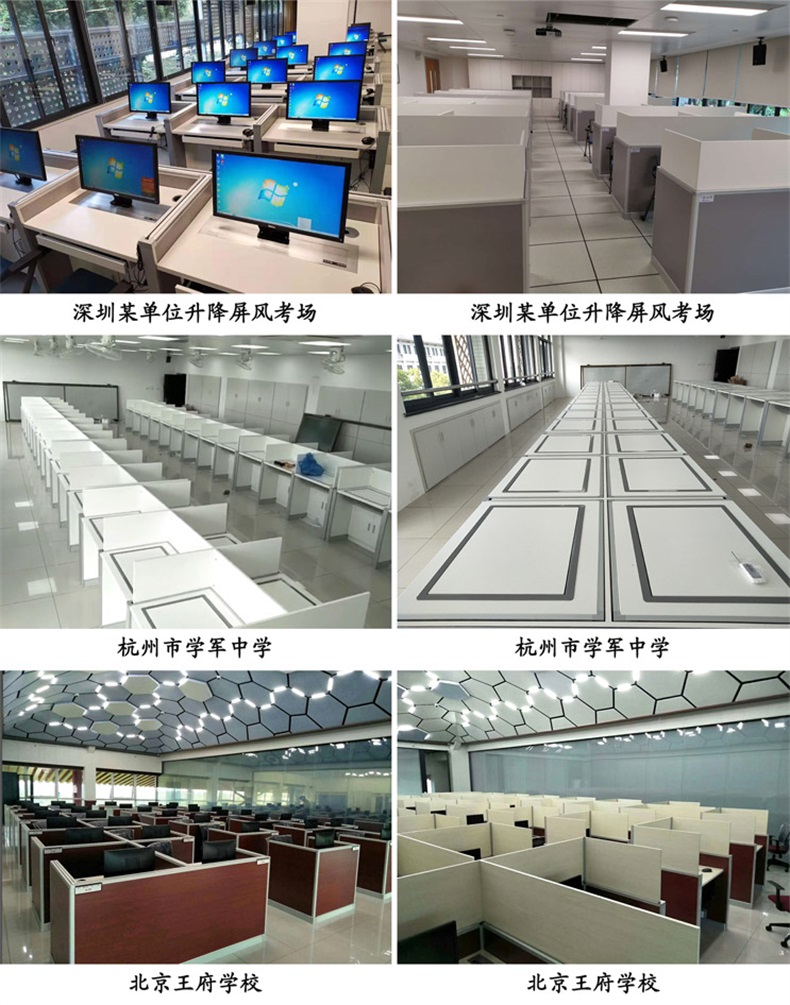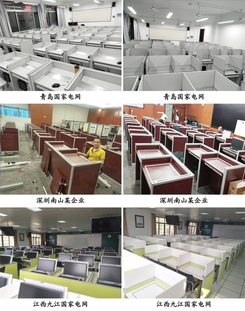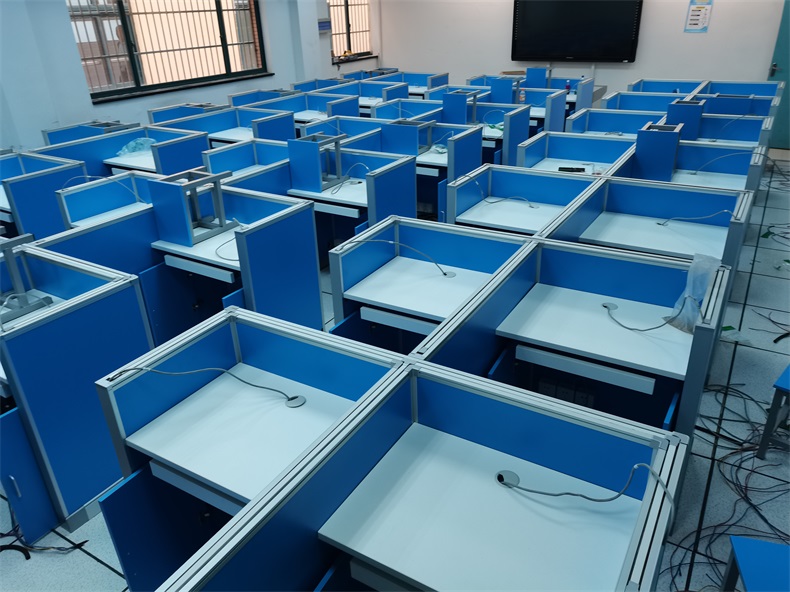 根據(jù)上海科技管理學(xué)校對測試實驗實訓(xùn)室和編碼實訓(xùn)室使用需求,在產(chǎn)品設(shè)計方面,電腦桌的左、右、前三面帶升降屏風(fēng)擋板,用于隔斷相鄰考生視線。當(dāng)屏風(fēng)升起時,可以用作教室計算機標(biāo)準(zhǔn)化考試使用,當(dāng)屏風(fēng)降下時,可以用于學(xué)生上課使用。實現(xiàn)了一室多用、考學(xué)合一。