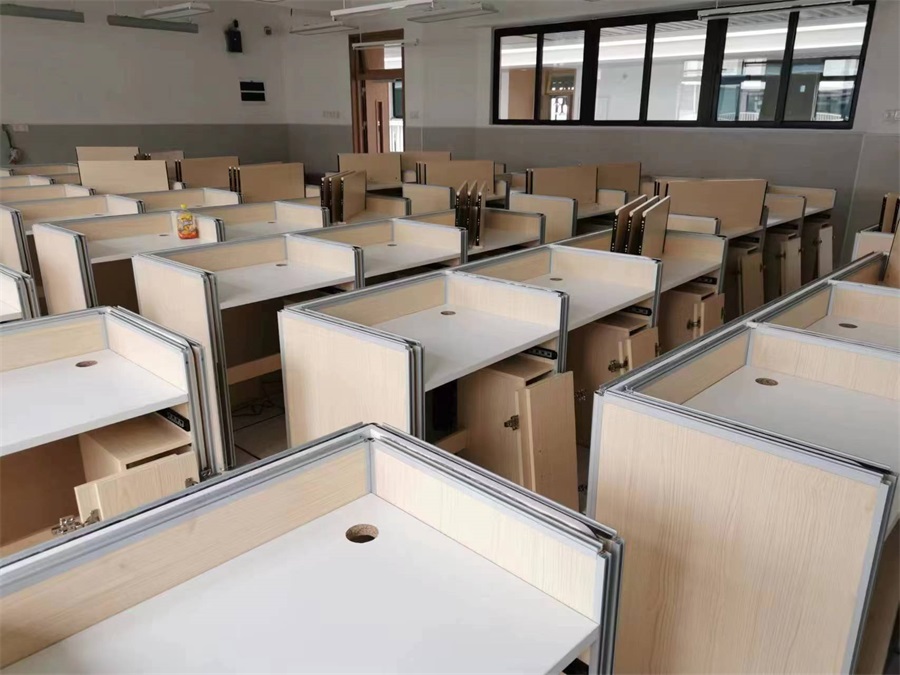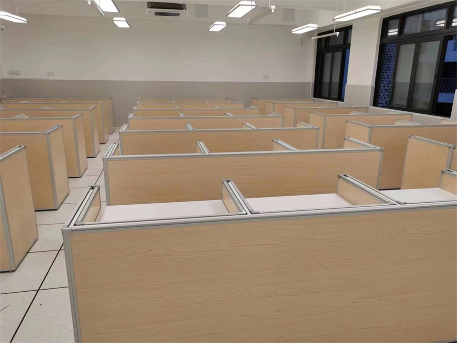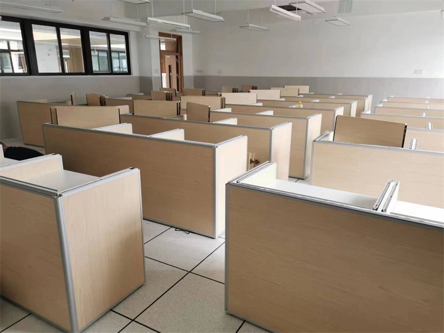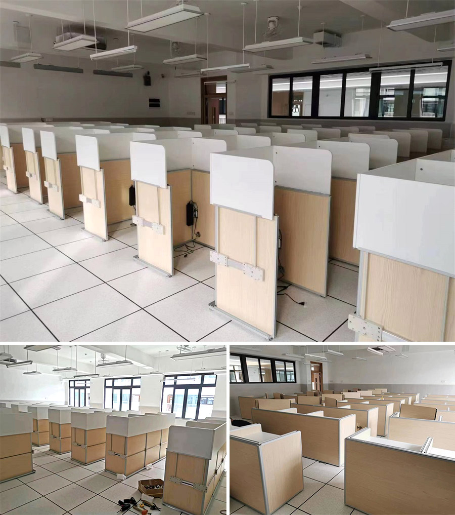 根據深圳市教育科學研究院實驗學校對升降屏風語音教室的使用需求,方方智能對該語音室設計了一套可以升降的智能升降屏風桌,每個座位都有可升降的屏風,考試時屏風升起后可有效的隔斷相鄰人的正常視線,防噪音效果,可達到互不干擾的作用,當屏風降下時,可以用于學生日常上課使用。實現了一室多用、考學合一。