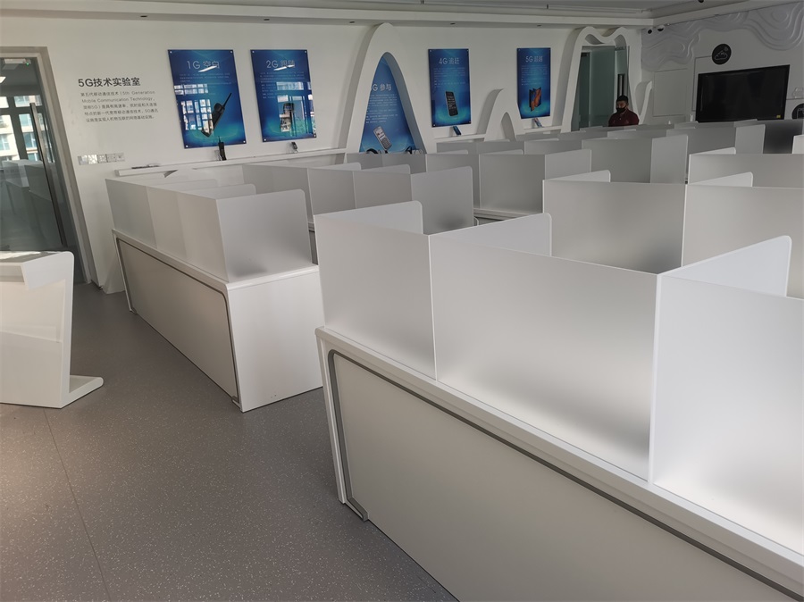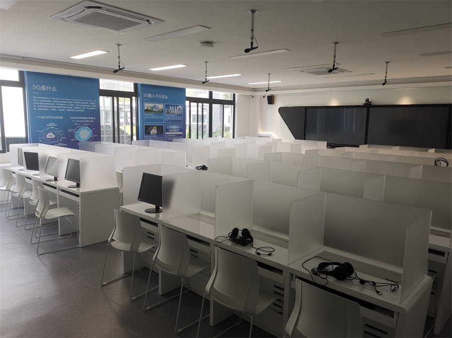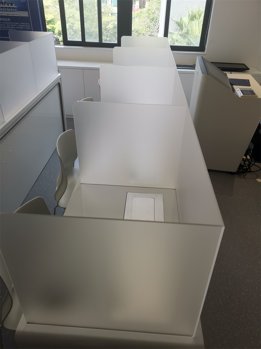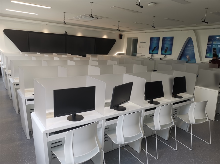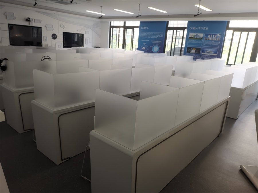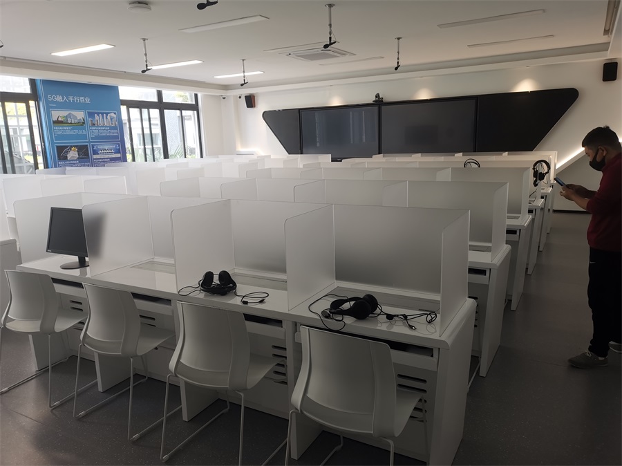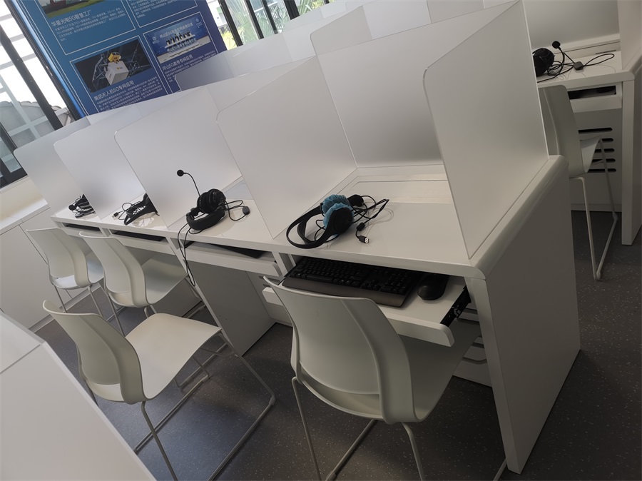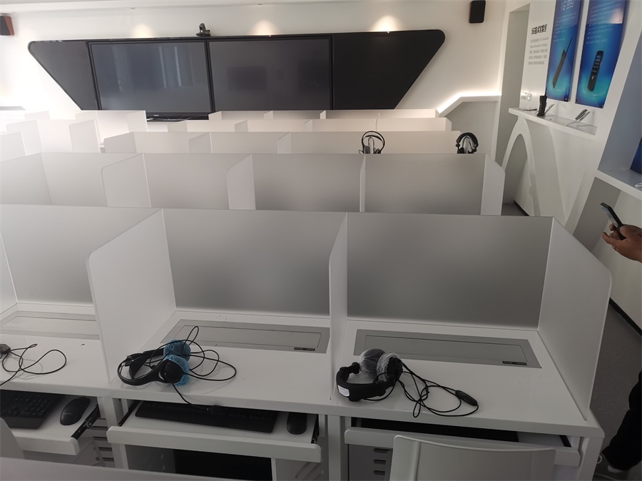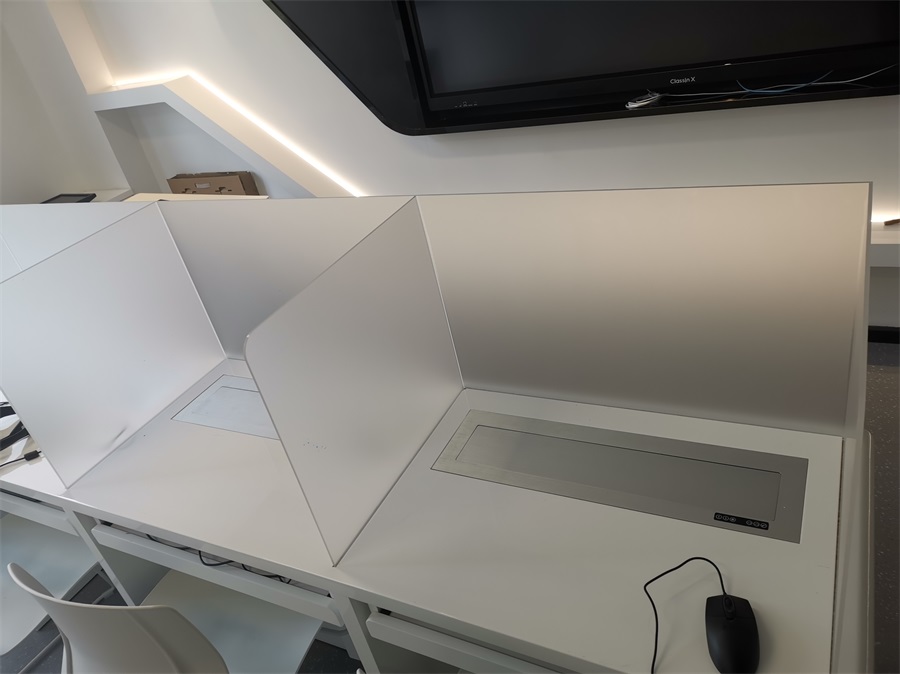 根據(jù)深圳明德實(shí)驗(yàn)學(xué)校對語音多媒體教室的使用需求,方方智能對該語音室設(shè)計(jì)了一套固定亞克力屏風(fēng)桌,每個座位都有可升降的液晶屏升降器,可根據(jù)上課或考試需要,一鍵升降電腦顯示屏幕。實(shí)現(xiàn)了一室多用、考學(xué)合一。