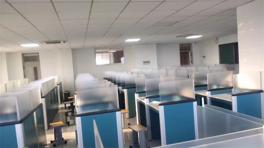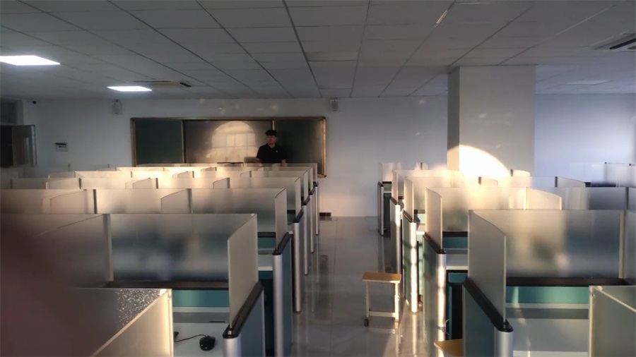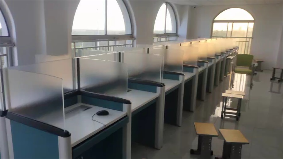 根據(jù)山東臨沂電力學(xué)校對(duì)升降屏風(fēng)語(yǔ)音教室考場(chǎng)的使用需求,本次教室設(shè)計(jì)了一套智能升降屏風(fēng)桌,每個(gè)座位都有可升降的屏風(fēng),考試時(shí)屏風(fēng)升起后可有效的隔斷相鄰人的正常視線,防噪音效果,可達(dá)到互不干擾的作用,平時(shí)培訓(xùn)學(xué)習(xí)時(shí)屏風(fēng)降下;每個(gè)桌子桌面裝有液晶屏升降器,需要使用顯示屏?xí)r,隱藏在桌子內(nèi)部的液晶屏升降器把顯示屏從桌子下面升到桌子上面;當(dāng)不使用顯示屏?xí)r,液晶升降器自動(dòng)下降,顯示屏隱藏在桌子內(nèi)部,起到防盜、防塵作用,保持桌子表面的平整和美觀,和普通的教室無(wú)異,升降屏風(fēng)桌實(shí)現(xiàn)了空間資源進(jìn)行最大化的利用,平衡解決了師生之間的溝通與學(xué)生考試相互干擾的需要,滿足一教室多用的需求
