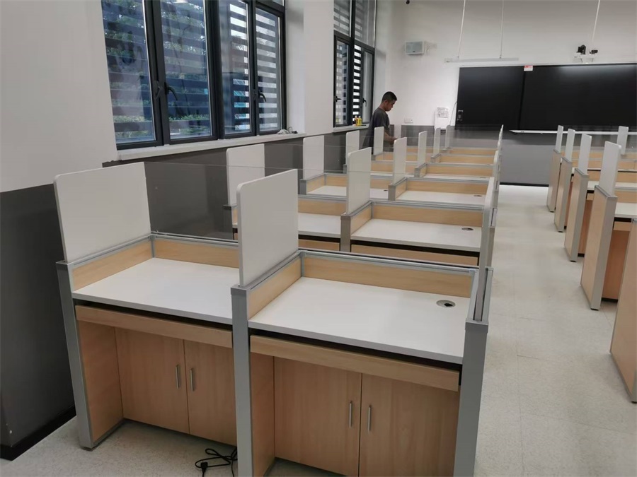 在計算機教室建設方面,根據上海交通大學醫學院的特殊需求,方方智能團隊給該校定制一款升降屏風桌,每個座位都有可升降的屏風,相鄰座位之間帶可升降磨砂玻璃,升降行程為450mm,屏風升起后可有效的隔斷相鄰人的正常視線,防噪音效果,可達到互不干擾的作用,當屏風降下時,可以用于學生日常上課使用。實現了一室多用、考學合一。升降擋板為單面磨砂玻璃,讓整個場景更通透,減少屏風升起時,格子間帶來的密集感。每個座位有可升降的一體機升降器(可遙控一鍵整個教室一體機集中升降),一體機為23.8寸聯想品牌。升降器把一體機下降隱藏在桌子內部時,與普通課桌一樣桌面平齊,可一室多用。