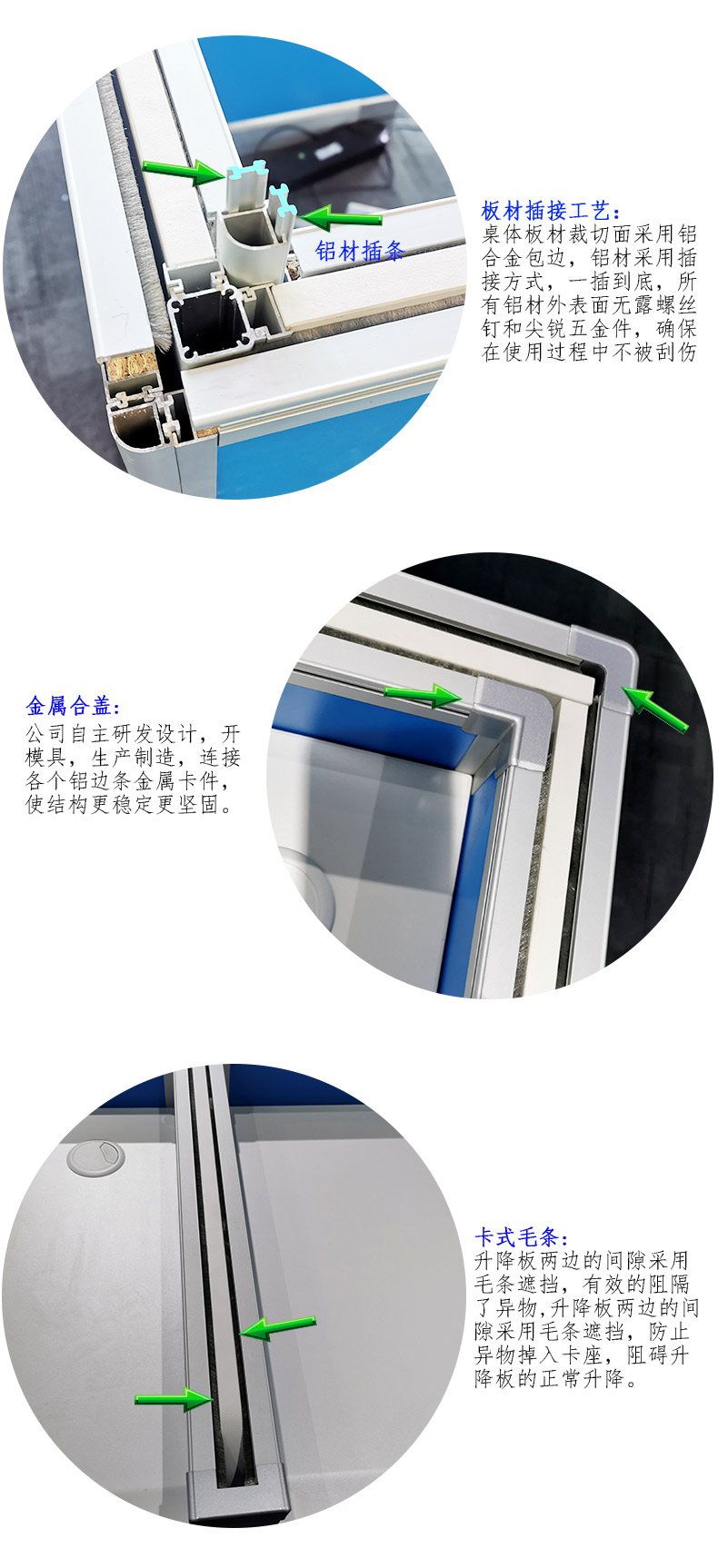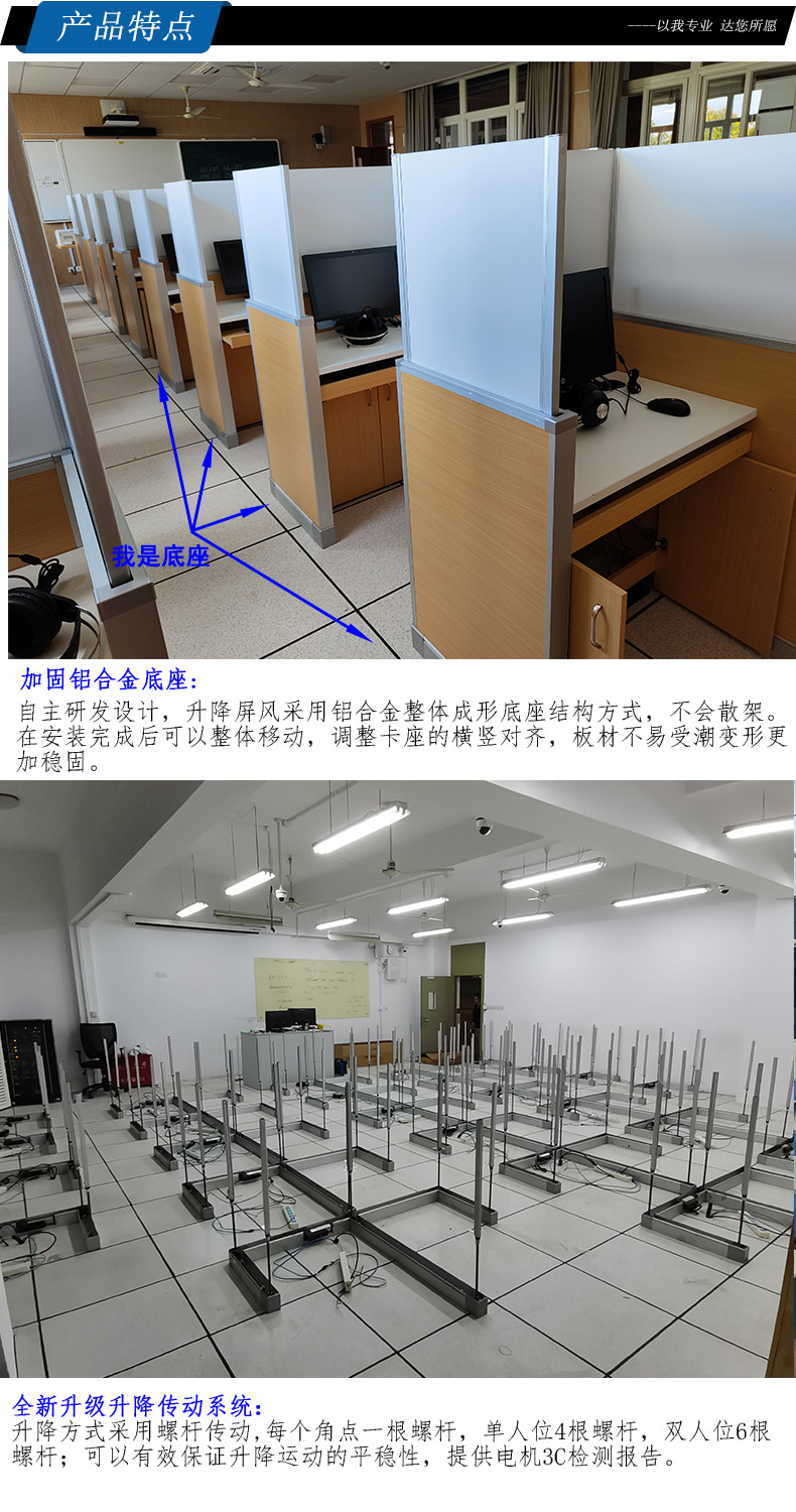 4、*升降屏風(fēng)采用一體成形鋁合金型材整體包邊,升降底座固定架采用84*68*1.5mm雙層鋁合金底座安裝完成可整體移動(dòng),調(diào)整卡座的橫豎對(duì)齊,板材不易受潮變形更加穩(wěn)固;桌體采用鋁材插接方式連接,所有外表不漏螺絲釘或尖銳五金件,確保使用身體不被劃傷。