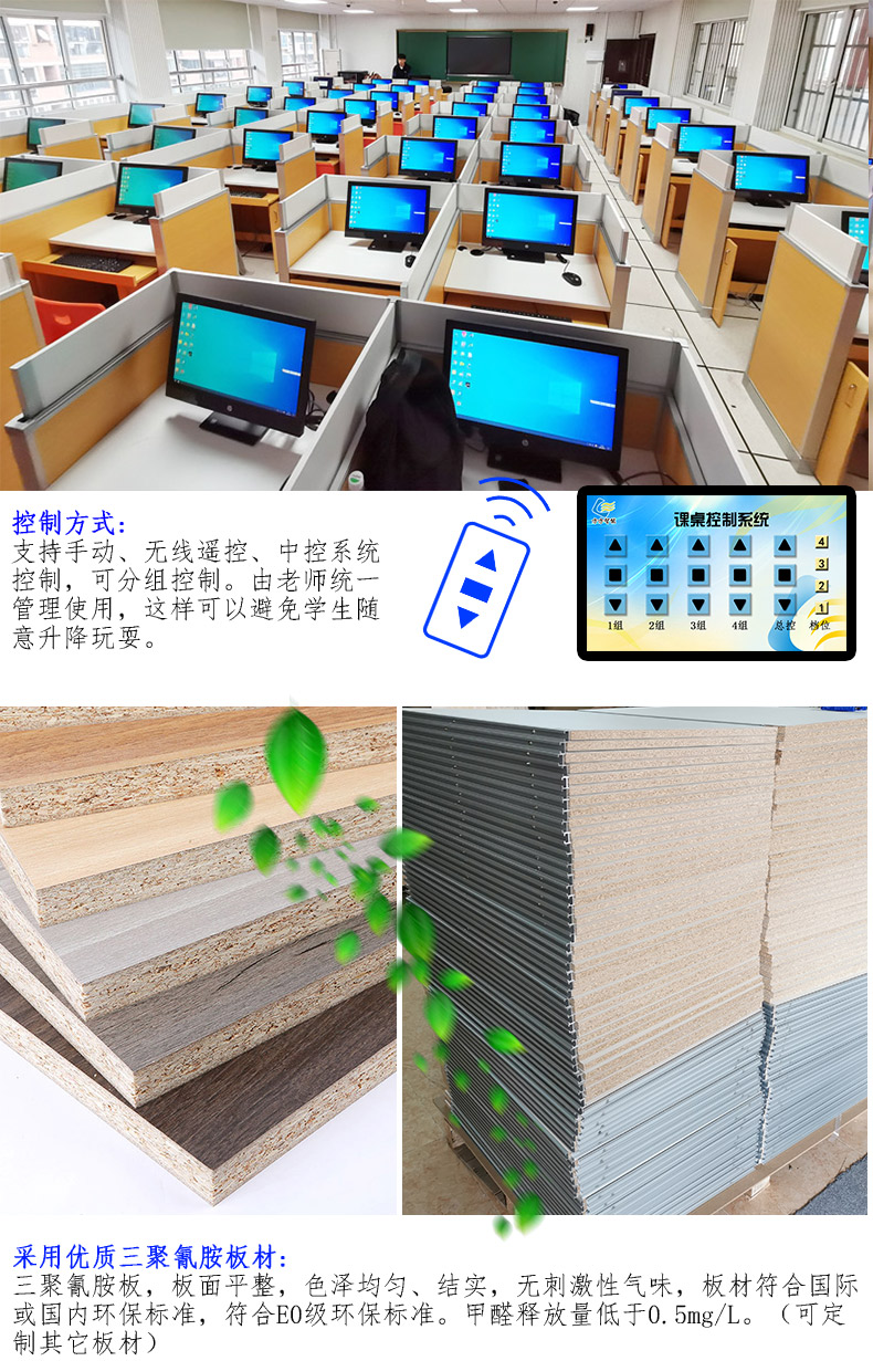 2、桌體及升降板采用15-16mm三聚氰胺板,桌面采用25mm厚三聚氰胺板材(可定制桌面貼防火板飾面,邊緣做鴨嘴邊造型)。色澤均勻,板面結(jié)實(shí)、無刺激性氣味,板材優(yōu)于國家及相關(guān)行業(yè)環(huán)保標(biāo)準(zhǔn)。*提供生產(chǎn)廠家符合GB18580-2017《室內(nèi)裝飾裝修材料人造板及其制品中甲醛釋放限量》板材檢測報(bào)告。