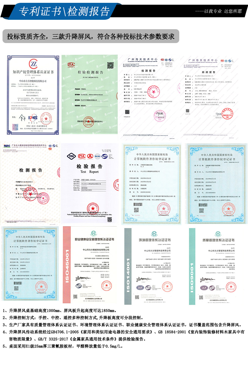 11、*升降屏風(fēng)符合GB 18584-2001《室內(nèi)裝飾裝修材料木家具中有害物質(zhì)限量》、GB/T 3325-2017《金屬家具通用技術(shù)條件》提供生產(chǎn)廠家檢驗(yàn)報(bào)告。升降屏風(fēng)傳動(dòng)系統(tǒng)符合GB4706.1-2005《家用和類似用途電器的安全通用要求》提供生產(chǎn)廠家檢測報(bào)告。
